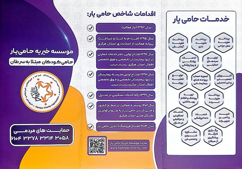 موسسه خیریه " حامی یار " فعال در حوزه سلامت کودکان و حامی کودکان مبتلا به سرطان با یک دهه فعالیت به عنوان اولین و تنها تشکل ملی استان مرکزی، دارای پروانه فعالیت از وزارت کشور می باشد.