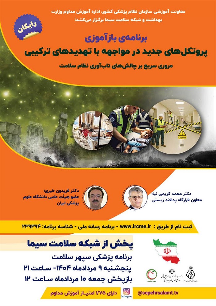 به اطلاع کلیه گروه های پزشکی، دندان پزشکی، داروسازی و تمامی رشته های پیراپزشکی می رساند، معاونت آموزشی و پژوهشی سازمان نظام پزشکی و ادراه آموزش مداوم وزارت بهداشت، با توجه به ضرورت ارتقاء آمادگی و تاب آوری جامعه پزشکی در مواجهه با تهدیدات نوین و ترکیبی، در راستای روزآمدسازی دانش حرفه ای اعضا و با هدف آگاهی بخشی تخصصی، برنامه بازآموزی تلویزیونی با عنوان "پروتکل های جدید مواجهه با تهدیدهای ترکیبی" را با محوریت مروری سریع بر چالش های تاب آوری نظام سلامت، برگزار می نمایند.