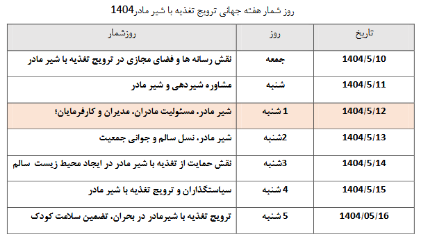 10تا16مردادماه، هفته جهانی تغذیه با شیر مادر می باشد. روز شمار و دستورالعمل مسئولیت مادران، مدیران و کارفرمایان، در خصوص تغذیه با شیر مادر، برای اطﻼع رسانی به جامعه هدف به پیوست می باشد.
