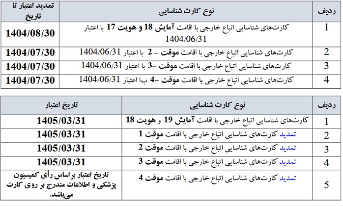 اعتبار کارت های شناسایی آمایش های ۱۸و ۱۹ هویت ۱۷ و ۱۸ و کارت های اقامت ۱ تا ۴ پناهندگان جمعی